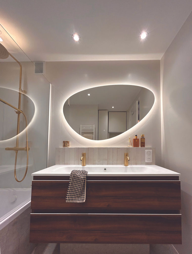 Le point fort de cette salle d'eau est le miroir asymétrique qui, une fois allumé, diffuse de la lumière et met également en valeur les angles des murs et du plafond.